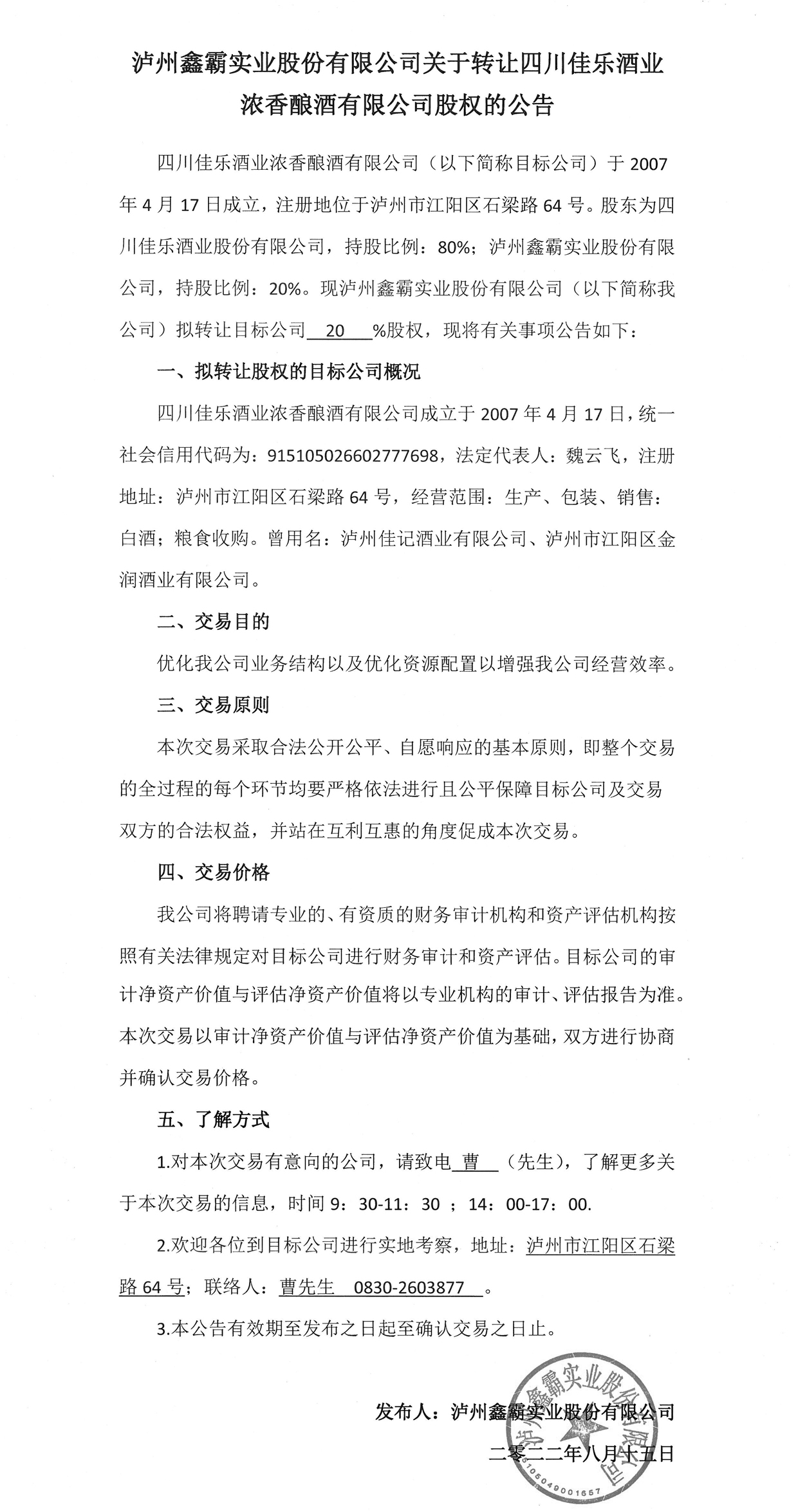 瀘州鑫霸實(shí)業(yè)股份有限公司關(guān)于轉(zhuǎn)讓四川佳樂酒業(yè)濃香釀酒有限公司股權(quán)的公告
