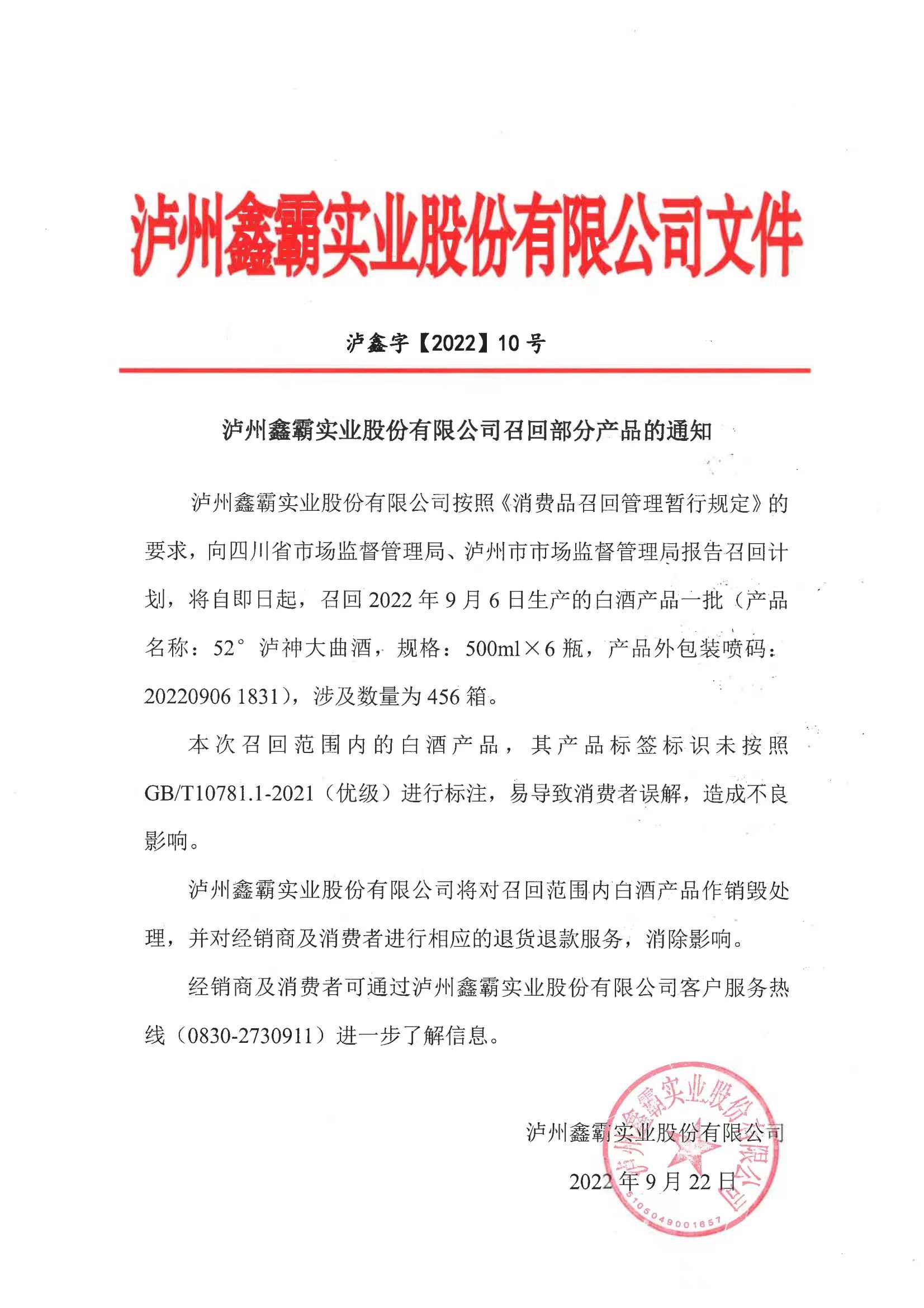 瀘州鑫霸實業(yè)股份有限公司召回部分產(chǎn)品的通知